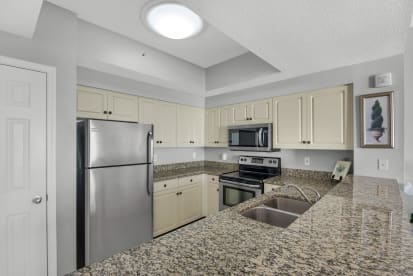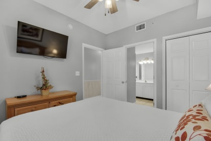 The master bedroom features a king-size bed and a private bathroom with a dual vanity. The second bedroom has a welcoming queen-size bed, and the living room includes a queen-size sleeper sofa. With a washer and dryer in the unit, this vacation rental can accommodate up to 6 guests for a pleasant beach getaway.