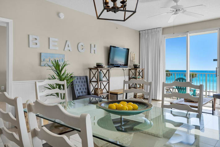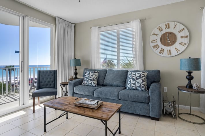 Remarkable Gulf view 3 bedroom, 3 bath Majestic Sun 214B vacation rental condo at Seascape Resort in Miramar Beach, FL. This is a highly desirable end unit on the 2nd floor offering unobstructed panoramic views of the Gulf of Mexico. This unit includes a covered parking space. The interior has just been updated with brand new paint and was professionally decorated. Not only do you have stunning views of the Gulf of Mexico, but the calm coastal colors extend inside the condo for an inviting atmosphere.Access the private balcony from the living area or the master king suite. It’s the perfect place to relax, dine and watch the beautiful sunsets the Emerald Coast has to offer. Being on the second level and right across from the beach, you’re able to hear the sound of waves crashing, transcending you to a relaxed state. The interior of this unit offers a spacious and open floor plan. The kitchen has ample cabinets, pantry & raised breakfast bar for casual dining. The master king suite faces the Gulf with exceptional views along with balcony access, a walk-in closet and private bathroom. The master bath offers a double vanity. The split floor plan allows for privacy. The second bedroom is a queen suite with a private bathroom. The third bedroom offers 2 twin over twin bunk beds. Perfect for a large family of 8 to stay while on vacation. A washer and dryer are located in the unit.