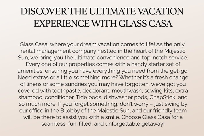 With this rental, you are provided with two beach chairs and an umbrella in your vacation rental condo that you can take to the beach, in lieu of spending $40 a day using the local beach service operator. For added convenience, our office is onsite, on the ground floor of the B building in Majestic Sun should you need anything.