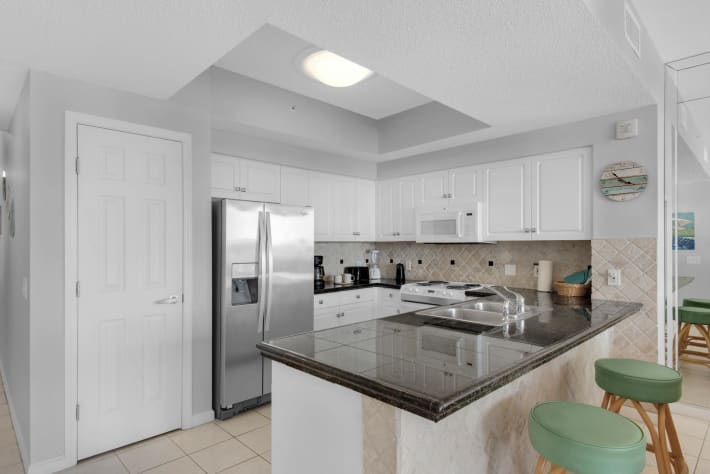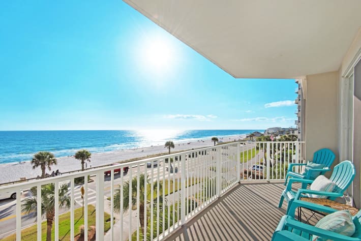 Majestic Sun 311B at Seascape Resort in Miramar Beach, FL is a beautiful, updated, Gulf view deluxe beach condo located directly across from the beach on the third floor and sleeps a total of 6. This vacation rental condo offers amazing Gulf views from all common areas including the master suite! Wake up and enjoy your morning coffee while taking in the beautiful sights of the sugar white sands and Summers breeze from your private balcony. With this rental, you are provided with two beach chairs and an umbrella in your condo that you can take to the beach, in lieu of spending $40 a day using the local beach service operator. For added convenience, our office is onsite, on the ground floor of the B building in Majestic Sun should you need anything.Upon entering this 2 bedroom, 2 bath deluxe vacation rental condo, you will find a living area where you can admire the beauty of the Gulf or watch the HDTV. The kitchen is fully equipped with everything you would need for a home cooked meal while the dining area and breakfast bar can seat up to 6. Enjoy your meals at the dining table with beautiful views the Emerald Coast has to offer! The master king suite offers beautiful views of the beach with access to the private balcony, an HDTV and private bath. The second bedroom has a two twin sized beds, an HDTV, and an attached bath. The queen sleeper sofa in the living room offers additional sleeping arrangements. This unit conveniently offers a laundry room and sleeps a total of 6.