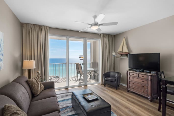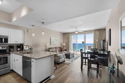 Majestic Sun 1008B at Seascape Resort in Miramar Beach, FL is a beautiful newly renovated, beach view, 1 bedroom, 2 bathroom beach condo located directly across from the beach on the tenth floor and sleeps a total of 6. This vacation rental condo offers amazing beach views from all common areas and the private balcony! Wake up and enjoy your morning coffee while taking in the beautiful sights of the sugar white sands and Summers breeze from your private balcony. With this rental, you are provided with two beach chairs and an umbrella in your condo that you can take to the beach, in lieu of spending $40 a day using the local beach service operator. For added convenience, our office is onsite, on the ground floor of the B building in Majestic Sun should you need anything.Upon entering this newly renovated and updated 1 bedroom, 2 bath vacation rental condo, you will find a comfortable living area where you can admire the beauty of the Gulf or watch the HDTV. The living area also offers a queen size sleeper sofa. The kitchen features stainless steel appliances, a Keurig machine as well as a regular coffee maker, and is fully equipped with everything you would need to prepare a home-cooked meal while the dining area and breakfast bar can seat guest comfortably. Enjoy your meals at the dining table with beautiful views the Emerald Coast has to offer! The master king suite offers an HDTV and private bath. This unit also provides a twin over twin bunk nook area off the hallway, perfect for small children. There is a full bathroom located off the common areas as well. A washer and dryer can be found in the unit at your convenience. This vacation rental, Majestic Sun 1008B, sleeps a total of 6. Perfect for your next family vacation to the beach!