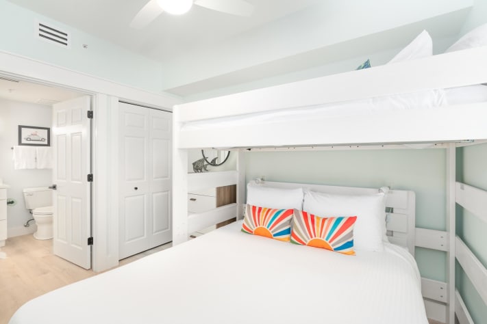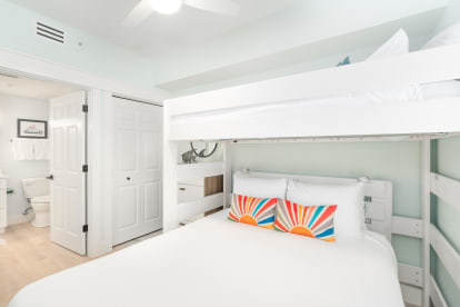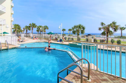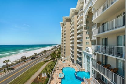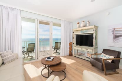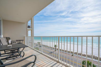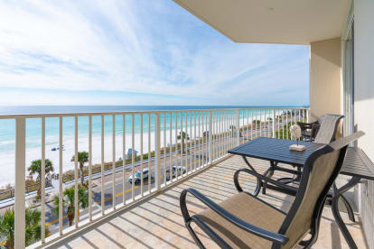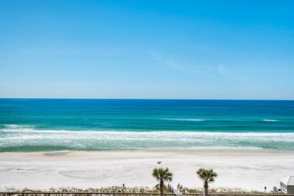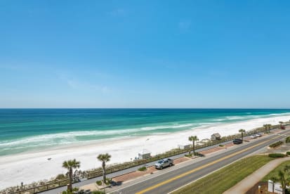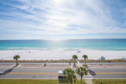 Upon entering this 2 bedroom, 2 bath deluxe vacation rental condo, you will find a large kitchen as well as a comfortable living area where you can admire the beauty of the beach or watch the HDTV. The living area also offers a queen size sleeper sofa. The kitchen features stainless steel appliances, a Keurig machine & all the appliances needed to prepare a home cooked meal. Enjoy your meals at the dining table and breakfast bar with beautiful views of the Gulf that the Emerald Coast has to offer! The master king suite offers an HDTV, remarkable Gulf views with access to the private balcony and has its own private bathroom. The second bedroom offers a queen bed with a twin bunk over , an HDTV, and access to an attached bathroom. This spacious unit conveniently offers a laundry room with a washer and dryer and sleeps a total of 7.