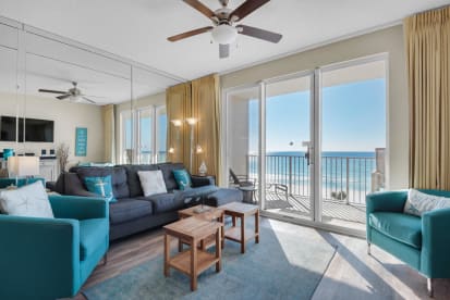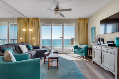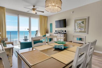 If you are ready for an incredible beach vacation on the Gulf of Mexico, look no further than this 4th floor Majestic Sun 413B updated condo in Miramar Beach, FL at Seascape Resort! This two bedroom deluxe condo features some of the most breathtaking views of the beach you can find, from all common areas and master bedroom. Watch the sunset from the private balcony or stroll over the boardwalk and put your toes in the sugar white sands.As you enter this incredible updated vacation rental condo, you are greeted with a full kitchen with stainless steel appliances and a Keurig coffee machine, a dining area that seats 10, and a beautiful living room that leads to the private balcony with full Gulf views. The living room offers a queen size sofa sleeper and an ottoman that contains a twin size sleeper sofa. The master bedroom features a luxurious king-size bed, an HD TV, private bathroom, and a balcony with breathtaking views as well. The second bedroom offers a king size bed, HD TV and an attached bath. With room for up to 7 guests, this deluxe condo is ideal for a beach getaway or a family trip to the Gulf Coast!