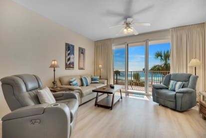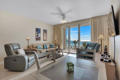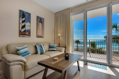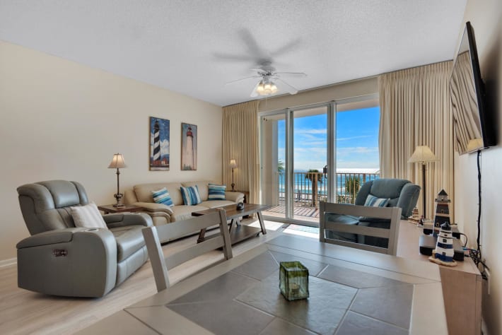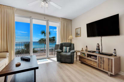 Enjoy beautiful views of the Gulf Coast from the 2nd floor of this vacation rental condo in Miramar Beach, FL, Majestic Sun 208A at Seascape Resort. Upon entering this newly renovated beach condo you’re welcomed with an open floor plan of the kitchen, dining, & living areas leading out to your very own private balcony with plenty of lounge chairs to take in the stunning sights of Summer. Majestic Sun 208A now features a fully remodeled kitchen with granite countertops, brand new stainless steel appliances including a fridge that dispenses filtered water & ice, a breakfast bar that seats 2, a dining area that seats 4, & a living area with a brand new queen size sleeper sofa & a new electric leather recliner, plus a new 65" HDTV. A full sized bathroom is located near the common areas with a washer & dryer in the unit. The master king suite comes equipped with a 55” Ultra HDTV & its very own private bath. The twin size bunk nook area is perfect for children or additional guests. Enough room to comfortably accommodate up to 6 guests. Our Emerald Coast waters can be viewed from all common areas of this vacation rental & with a balcony that offers full views of the sugar white sands & sparkling waters it can’t get much better than this!With this rental, you are provided with two beach chairs and an umbrella in your condo that you can take to the beach, in lieu of spending $40 a day using the local beach service operator. For added convenience, our office is onsite, on the ground floor of the B building in Majestic Sun should you need anything.