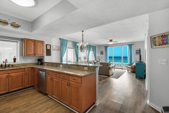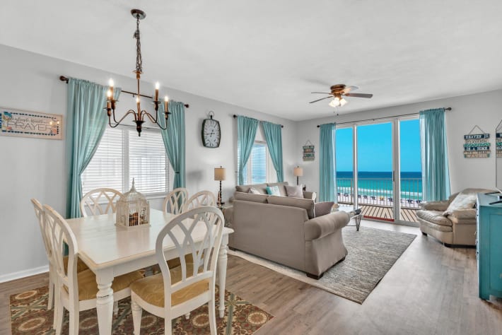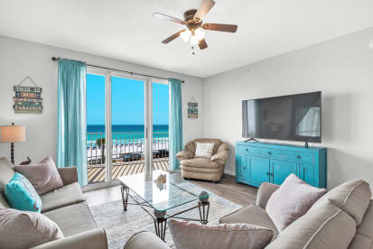 Enjoy stunning Gulf views at Majestic Sun from this beach updated condo during your next vacation in Miramar Beach, FL. Majestic Sun 301B at Seascape Resort is located directly across from the beach on the third floor and sleeps a total of 10. This newly updated vacation rental condo offers amazing Gulf views from all common areas including the master bedroom! Wake up and enjoy your morning coffee while taking in the beautiful sights of the sugar white sands and Summers breeze from your private balcony. With this rental, you are provided with two beach chairs and an umbrella in your condo that you can take to the beach, in lieu of spending $40 a day using the local beach service operator. For added convenience, our office is onsite, on the ground floor of the B building in Majestic Sun should you need anything.Upon entering this newly updated 3 bedroom, 3 bath vacation rental condo, you will find a comfortable living area where you can admire the beauty of the Gulf or watch the HDTV. The sleeper sofa in the living area can accommodate up to 2 guest. The kitchen is features new stainless steel appliances and is fully equipped with all the appliances you would need for a home cooked meal. The dining area can seat up to 6. Enjoy your meals at the dining table with beautiful views of the Gulf that the Emerald Coast has to offer! The master king suite offers an HDTV, remarkable Gulf views with access to the private balcony and has its own private bath. The second bedroom is a king suite with a an HDTV and private bath. The third bedroom has two twin bunk beds, HDTV, and an attached bathroom. This unit conveniently offers a laundry room and sleeps a total of 10.