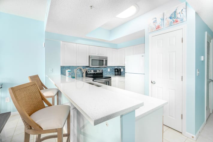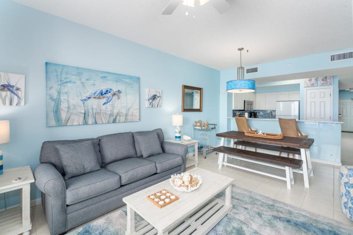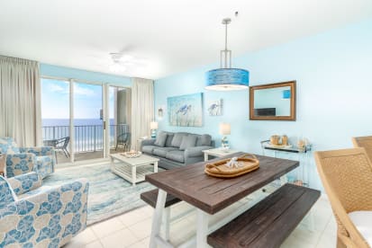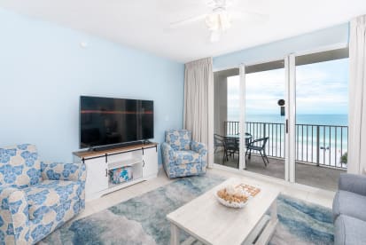 Majestic Sun 405A is a newly renovated Gulf view vacation rental beach condo in Miramar Beach, FL at Seascape Resort located directly across from the beach on the 4th floor and sleeps a total of 6 with 2 bedrooms and 2 bathrooms . This condo offers amazing Gulf views! Wake up and enjoy your morning coffee while taking in the beautiful sights of the sugar white sands and Summers breeze from your private balcony. With this rental, you are provided with 2 beach chairs and 1 umbrella in your condo that you can take to the beach, in lieu of spending $40 a day using the local beach service operator. For added convenience, our office is onsite, on the ground floor of the B building in Majestic Sun should you need anything.Upon entering this 2 bedroom, 2 bath vacation rental condo, you will find a comfortable living area where you can admire the beauty of the Gulf or watch TV. The sleeper sofa in the living area can accommodate up to 2 guests. The kitchen is fully equipped with all the appliances you would need for a home cooked meal. The dining area can seat up to 6. Enjoy your meals at the dining table with beautiful views of the Gulf that the Emerald Coast has to offer! The master king suite offers an HDTV, king size bed and has its own private bath. The second bedroom has a king bed, HDTV, and attached bath. This unit conveniently offers a laundry room and sleeps a total of 6.